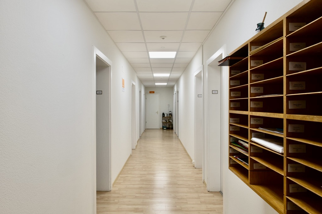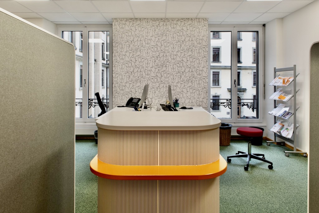 Notre intervention a couvert l’ensemble des espaces : bureaux, salles d’attente, zones de consultation, accueil et réception, ainsi que les espaces de vie comme la cuisine, la cafétéria et le réfectoire. Pour les finitions, nous avons procédé à un rafraîchissement complet des peintures, avec des teintes harmonisées, posé du papier ingrain et des papiers peints décoratifs, et repeint du mobilier afin d’offrir une cohérence visuelle et fonctionnelle à l’ensemble.
